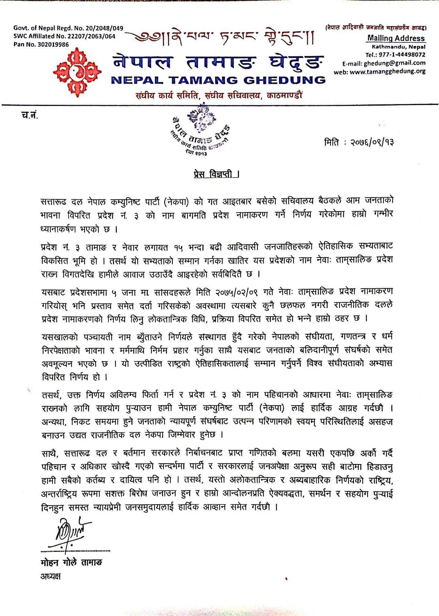 पुस १४, हेटौडा – तिन नम्बर प्रदेशको नाम बाग्मती राख्ने नेपाल कम्युनिष्ट पार्टी (नेकपा) को निर्णय प्रति नेपाल तामाङ घेदुङले गम्भीर आपत्ति जनाएको छ । आइतबार घेदुङका संघिय अध्यक्ष मोहन गोलेले बिज्ञप्ती जारि गर्दै संघीयताको अभ्यास बिपरित को निर्णय भएकाले अविलम्ब फिर्ता लिन आग्रह गरेको छ ।