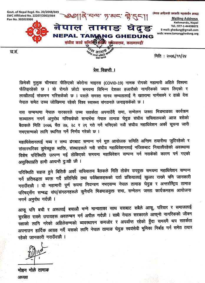 फाल्गुन २५, हेटौडा – आउदो चैत २७, २८ र २९ गते काठमाण्डौमा हुने भनिएको नेपाल तामाङ घेदुङको नवौ संघीय महाधिबेशन स्थगित भएको छ । हाल विश्वब्यापी फैलिरहेको कोरोना भाइरसको त्रासका कारण अर्को सुचना जारी नभएसम्मको लागि महाधिबेशन स्थगित गरिएको प्रेस बिज्ञप्ती मार्फत जानकारी गराइएको छ ।