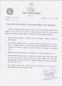 सोमबार राति जारी गरेको सूचनामा मंगलबार विहान ६ बजेदेखि चैत १८ गतेदेखि विहान ६ बजेसम्म कर्फ्यु आदेश जारी गरेको हो । प्रमुख जिल्ला अधिकारी रुद्रप्रसाद पण्डितले ५ बुँदे सूचना जारी गरेका छन् ।