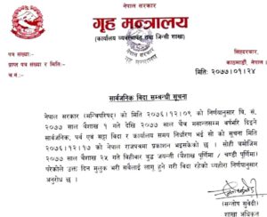 २०७६ चैत्र ९ गते बसेको मन्त्रिपरिषद्को निर्णयानुसार यस वर्षको चैत्र मसान्त सम्म वर्षभरी दिईने सार्वजानिक, पर्व एंव सट्टा विदा र कार्यालय समय निर्धारण भई सुचना पनि प्रकाशन भएकोले २५ गते सार्वजानिक विदा रहेको जनाइएको छ ।
