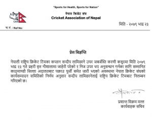 भदौ, काठमाडौं – नेपाल क्रिकेट संघ (क्यान) ले सन्दिप लामिछानेलाई राष्ट्रिय क्रिकेट टिमबाट निलम्बित गरेको छ । क्यानको कार्यसम्पादन समितिको निर्णयअनुसार आज उनलाई निलम्बन गरिएको हो ।