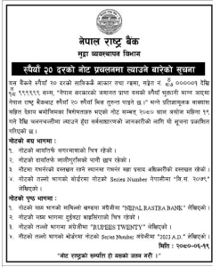 २० रुपैयाँको नयाँ नोट प्रचलनमा ल्याउँदै राष्ट्र बैंक