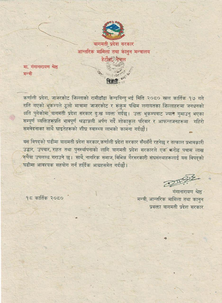 बागमती प्रदेश सरकारको प्रवक्ता एवम् आन्तरिक मामिला तथा कानुनमन्त्री गंगानारायण श्रेष्ठले शनिबार एक विज्ञप्ति जारी गर्दै गएराती कर्णाली प्रदेश अन्तरगत जाजरकोट र रुकुम पश्चिम गएको भूकम्पबाट पीडितहरु लागि राहात, उद्वार, र पुन निर्माणको लागि १ करोड ५० लाख उपलब्ध गराउने जानकारी दिनुभएको हो । उहाँँले बिपद्काे यश घडीमा बागमती प्रदेश सरकार कर्णाली प्रदेश सरकारकाे साथमा रहने बताउनु भयो ।