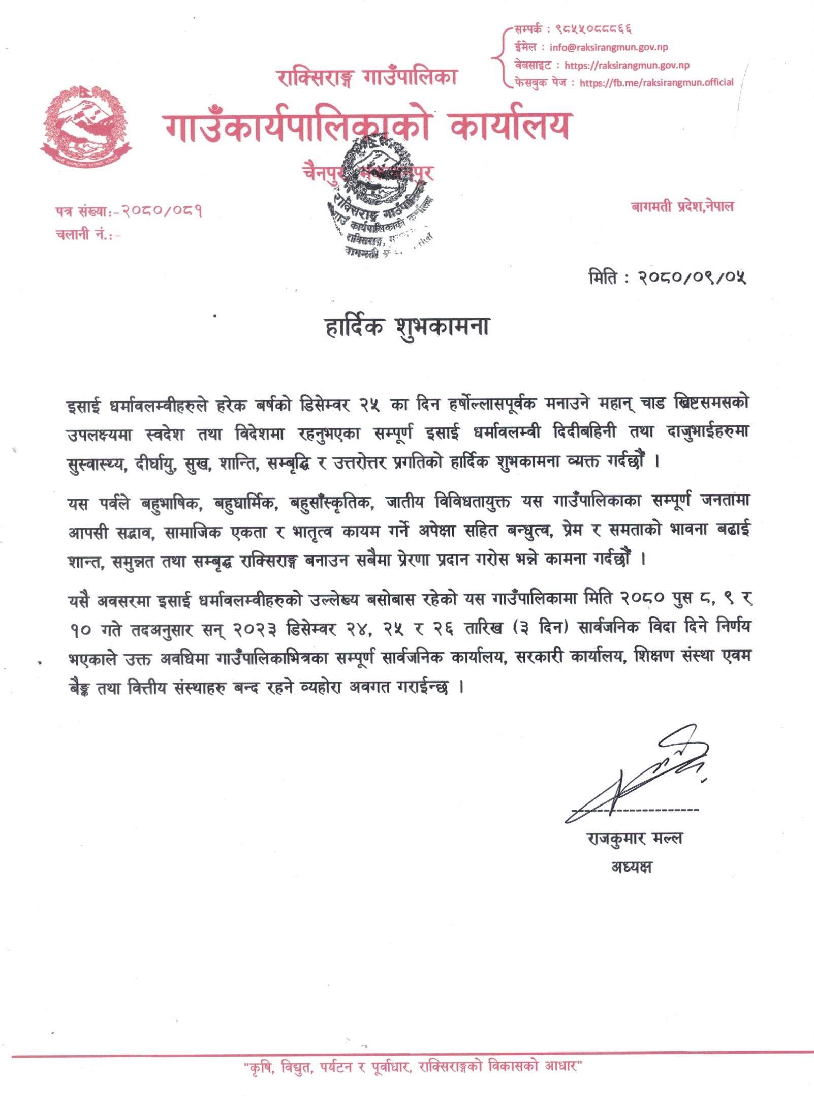 पुष, राक्सिराङ्ग (हेटौडा) – इसाई धर्मालम्बीहरुको नजिकिदै गरेको चाड ख्रीष्टमस डे को अवसरमा मकवानपुरको राक्सिराङ्ग गाउँपालिकाले तिन दिन सार्वजनिक बिदा दिएको छ । गाउँपालिकाले बिहिबार शुभकामना जारी गर्दै यहि पुष ८, ९ र १० गते तिन दिन सार्वजनिक बिदा दिएको हो ।