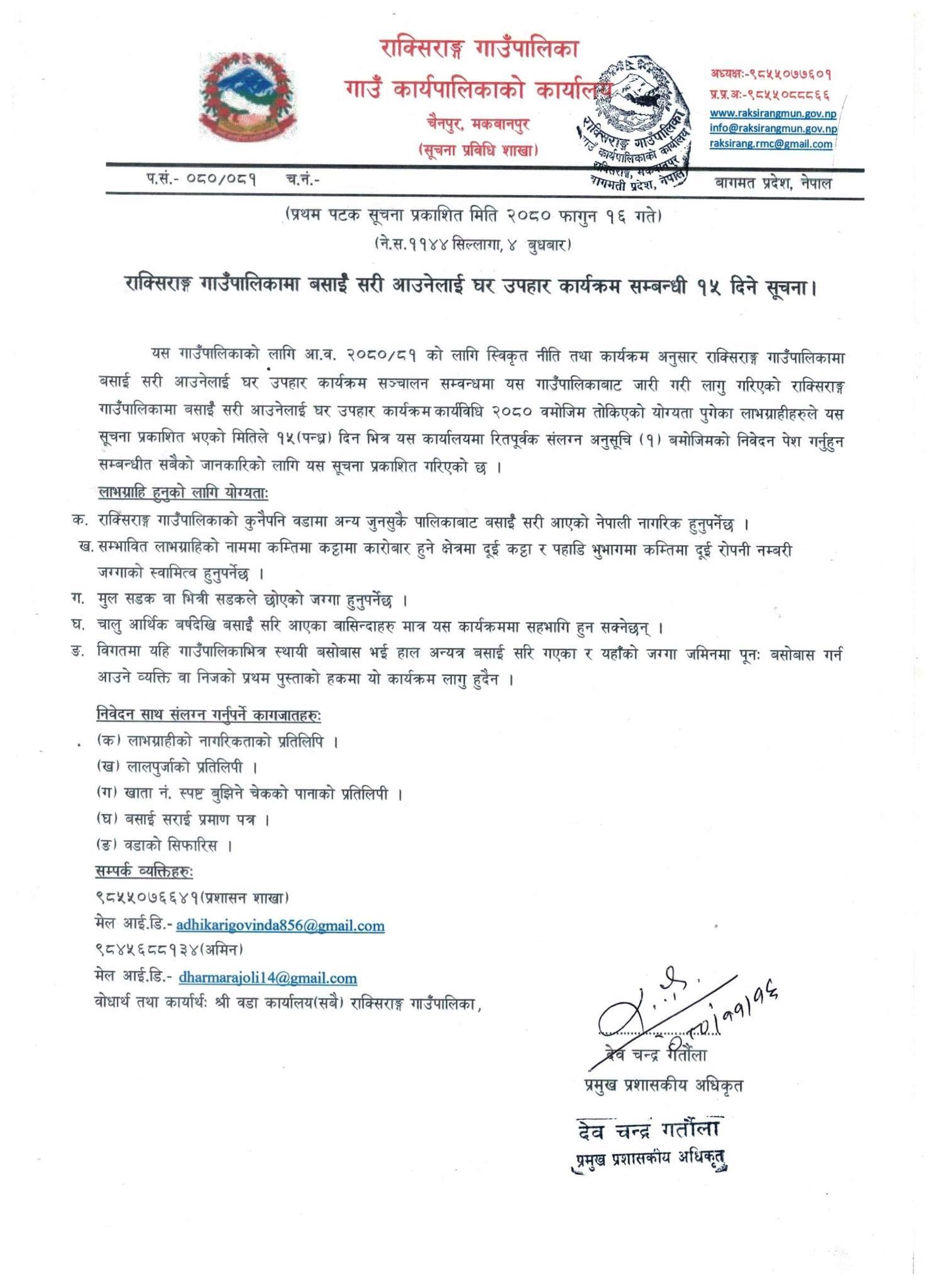 फाल्गुन, हेटौडा (राक्सिराङ्ग) – राक्सिराङ्ग गाउँपालिकाले बसाईसरी आउनेलाई घर उपहार दिने सम्बन्धि १५ दिने सुचना निकालेको छ । आर्थिक बर्ष २०८०/०८१ को नीति तथा कार्यक्रमबाट स्वीकृत घर उपहार कार्यक्रम कार्यविधि २०८० अनुसार तोकिएको योग्यता पुगेका लाभग्राहीहरुले सुचना प्रकाशित मितिले १५ दिन भित्र पेश गर्न भनिएको छ।