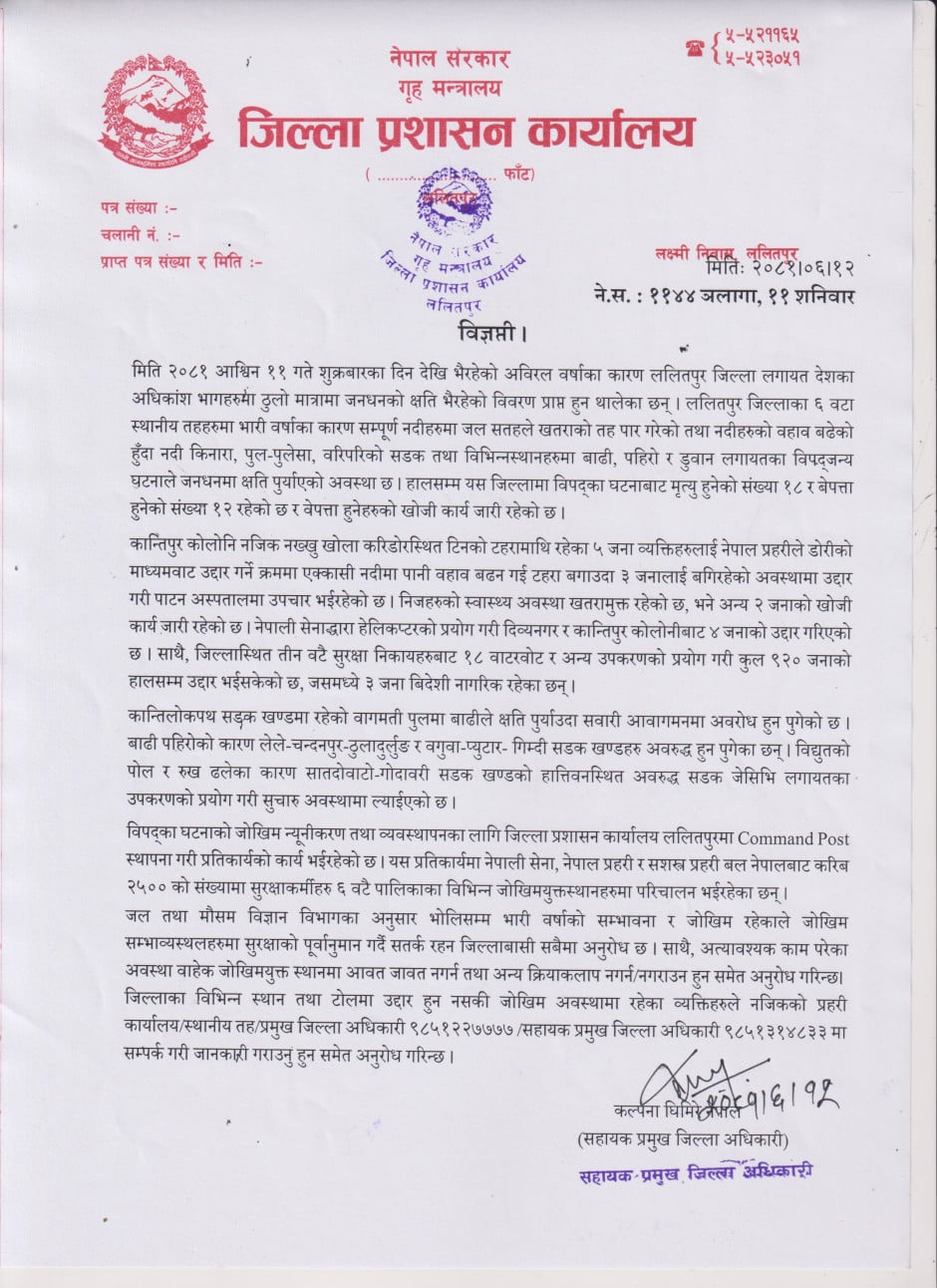 हालसम्म ललितपुर जिल्लामा विपद्का घटनाबाट मृत्यु हुनेको संख्या १८, बेपत्ता हुनेको संख्या १२ रहेको र वेपत्ता हुनेहरुको खोजी कार्य जारी रहेको विज्ञप्तिमा उल्लेख छ।