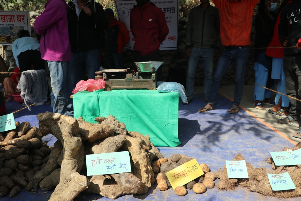 स्थानीय परम्परागत उत्पादनहरु गहत, मास, फापर, कोदोको पिठो, आलु, पिँडालु,सालको पातको दुना, फलामे औजारहरु, स्थानीय परिकार गिट्ठा, भ्याकुर, पिँडालु, तरुल, सिस्नु, लगायत लोकल कुखुरा, बंगुरको मासु, ताजा तरकारी, स्थानीय स्तरमा उत्पादित मौरी, चिउरीको मह लगायतका दर्जनौ स्टलहरु हाटबजारमा रहेको थियो ।