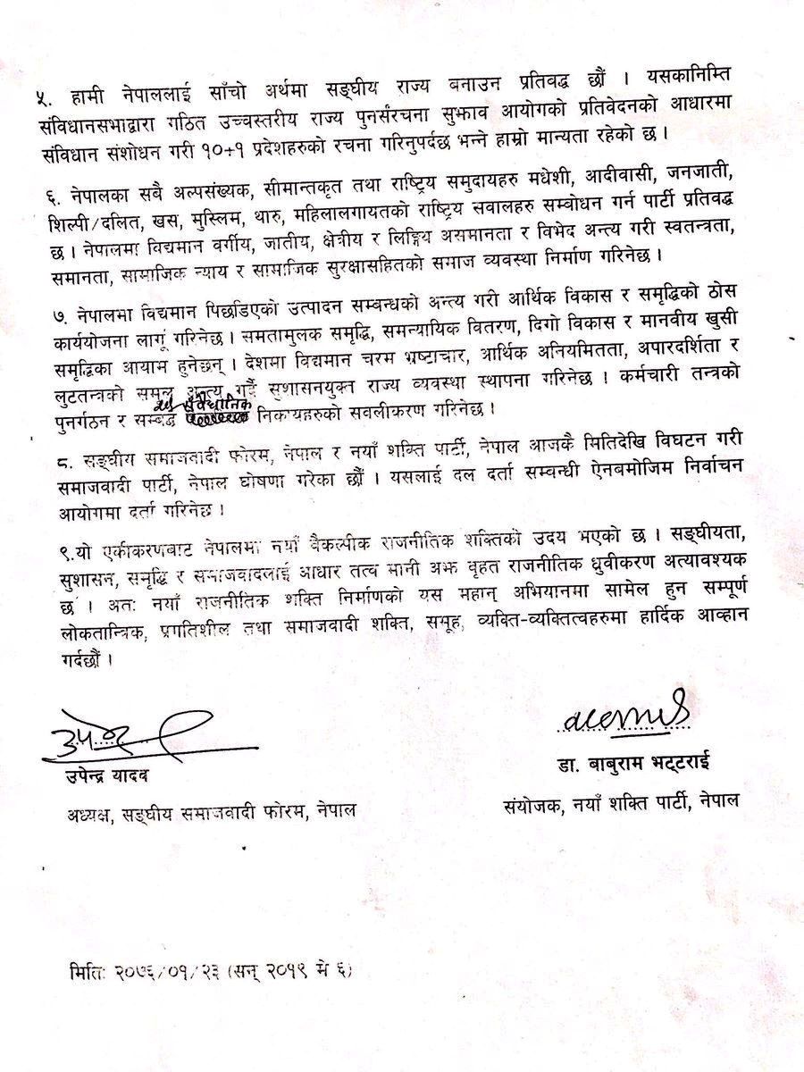 एकतासम्बन्धी समझदारीपत्रमा नयाँ शक्तिको तर्फबाट संयोजक बाबुराम भट्टराई र फोरमको तर्फबाट अध्यक्ष उपेन्द्र यादवले हस्ताक्षर गरे । एकता समारोहमा दुबै पार्टीका नेता तथा कार्यकर्ताले हल भरिभराउ थियो । एकीकृत पार्टीको नाम समाजवादी पार्टी नेपाल राखिएको छ ।