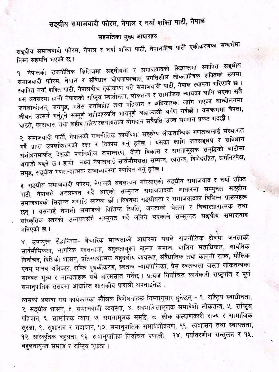 सहमतिको पहिलो नम्बरमा संघीयता र समाजवादको सिद्धान्तमा स्थापित फोरम र प्रगतिशील लोकतान्त्रिक शक्तिको रुपमा स्थापित नयाँ शक्तिबीच पार्टी एकीकरण गरेर समाजवादी पार्टी नेपाल स्थापना गरिएको उल्लेख गरिएको छ ।