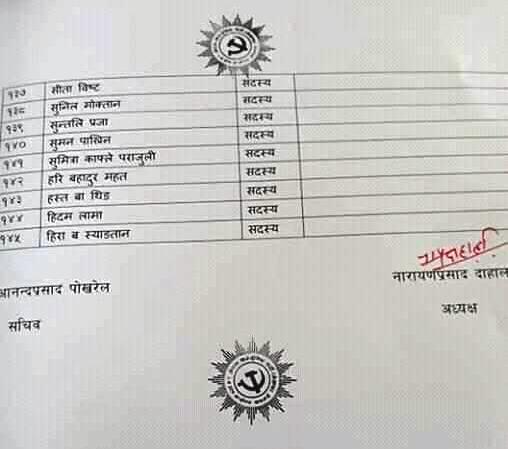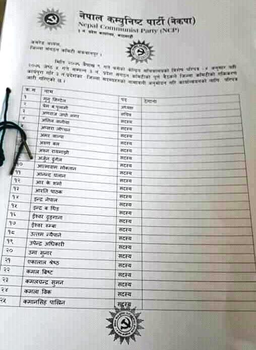 आइतबार बसेको नेकपाको प्रदेश कमिटिको वैठकले जिल्ला कमिटिमा तत्कालिन नेकपा एमाले र तत्कालिन नेकपा माओवादी केन्द्रबाट गरि १ सय ४५ जनाको नाम टुङ्ग्याएको हो । जिल्ला कमिटिको अध्यक्षमा तत्कालिन एमालेकी जिल्ला अध्यक्ष मुनु सिग्देल र सचिवमा तत्कालिन माओवादी केन्द्रका जिल्ला संयोजक प्रेम बहादुर पुलामी “छिन्तु” सचिव रहेका छन् ।