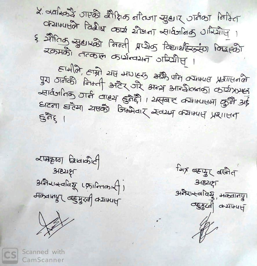 हेटौडा – हेटौंडाको मकवानपुर बहुमुखी क्याम्पसको प्रशासन, शुल्क काउण्टर र क्याम्पस प्रमुखको कार्यकक्षमा तालाबन्दी गरिएको छ । अनेरास्ववियु र अनेरास्ववियू (क्रान्तिकारी) मकवानपुर क्याम्पस इकाइले संयुक्त रुपमा विज्ञप्ती जारी गर्दै क्याम्पसमा तालाबन्दी गरेका हुन् ।