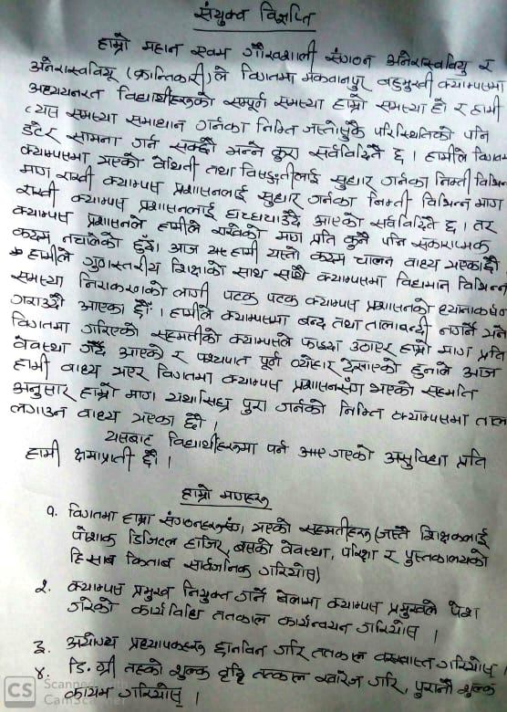क्याम्पसमा अध्यापन गराइरहेका अयोग्य प्राध्यापकहरुलाई तुरुन्त बर्खास्त गर्नुपर्नेसहित विज्ञप्तीम विभिन्न मागहरु उल्लेख गरिएको छ । क्याम्पस मा अयोग्य प्राध्यापकहरुले पढाइरहेको विषय अहिले निकै चर्चामा रहेकोले छानविन गरी अयोग्य प्राध्यपाकहरुलाई तुरुन्त बर्खास्त गर्नुपर्ने माग अघि सारिएको बिज्ञप्तिमा उल्लेख छ ।