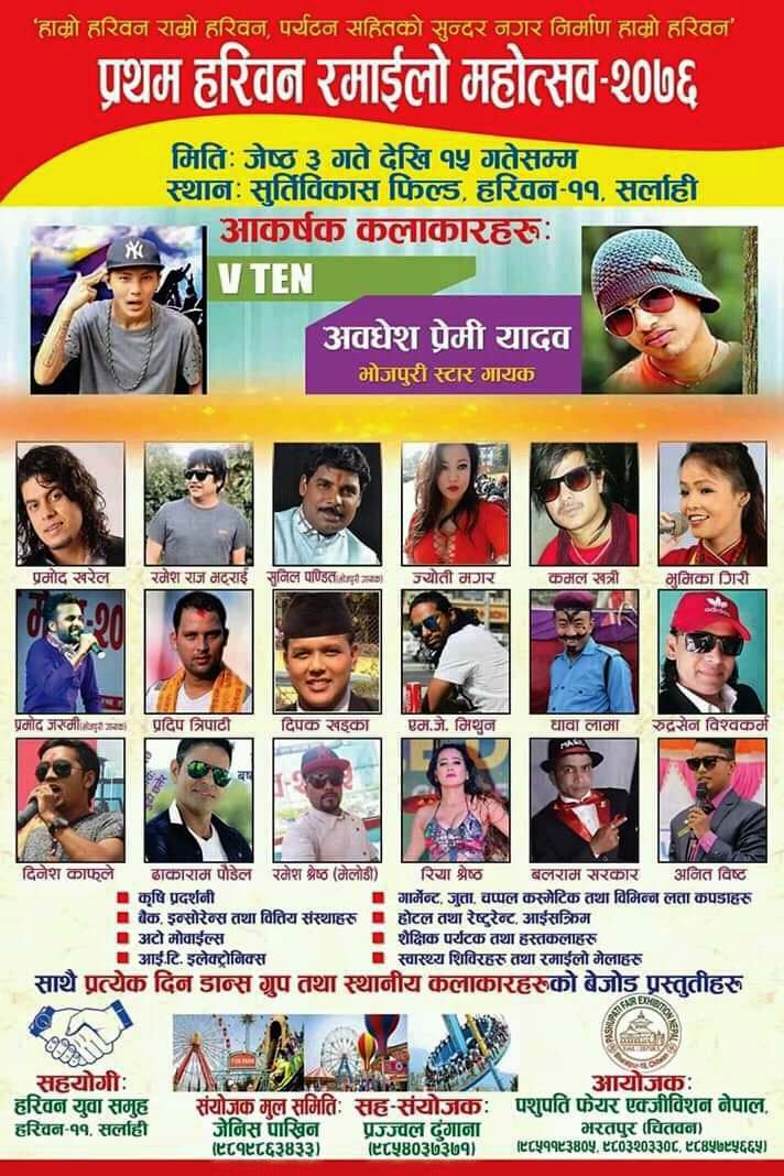 सर्लाही – सर्लाहीको हरिवनमा जेष्ठ ३ गतेबाट शुरु भएको प्रथम हरिवन रमाइलो महोत्सवमा आज पनि चर्चित कलाकारहरुले प्रस्तुति रहेको छ । आज हुने कार्यक्रममा गायक कमल खत्री, ढाकाराम पौडेल रुद्रसेन बिस्वकर्मा, जादुगर बलराम सरकार लगायत कलाकारहरुको प्रस्तुति रहने सर्लाहीबाट पत्रकार राजु तामाङले जनाएको छ ।