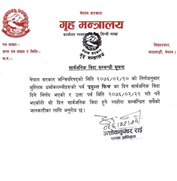 गृह मन्त्रालयले सूचना निकालेर इस्लाम धर्मावलम्बीको महान पर्व इद उल फित्रको अवसरमा सार्वजनिक बिदा दिने निर्णय भएको जनाएको छ । एक महिनासम्म दिनभर पानीसमेत नखाइ व्रत बसेका मुस्लिम समुदायले अन्तिम दिन इद उल फित्र मनाउने गर्छन् ।