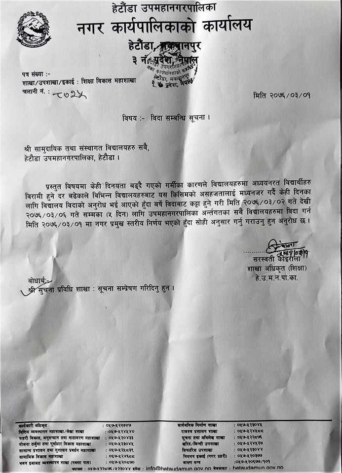 हेटौँडा उपमहानगरपालिका शिक्षा शाखाका अधिकृत सरस्वती कोईरालाले सूचना जारी गर्दै अत्याधिक गर्मिको कारण वर्षे विदामा कट्टी हुने गरि पाँच दिन बिदा दिईएको हो ।