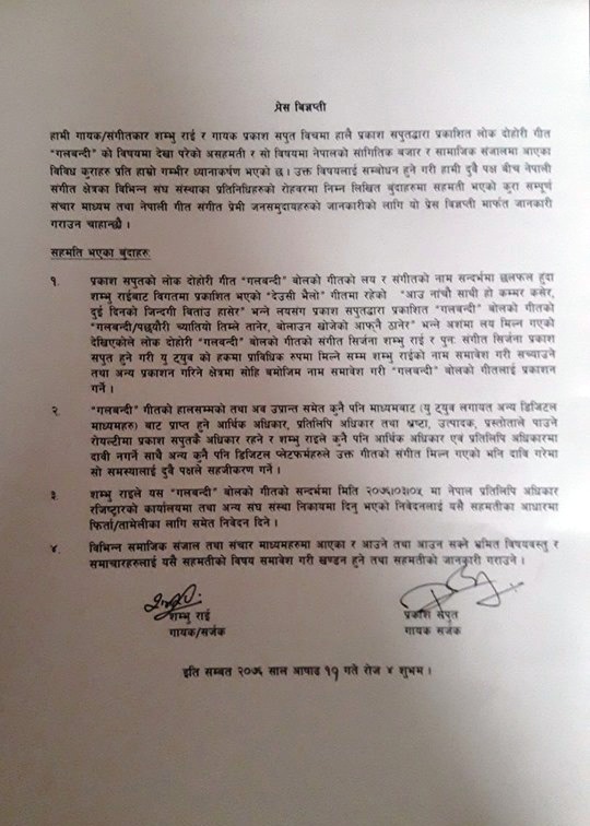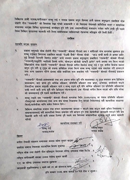 तर गलबन्दी गीतको संगीत सिर्जनामा शम्भु राईको नाम लेखिए पनि त्यसको सबै अधिकार प्रकाश सपूतमा रहने र आर्थिक आम्दानी पनि उनकै रहने सहमति भएको छ । त्यस्तै शम्भु राईले नेपाल प्रतिलिपी रजिष्ट्रारको कार्यालयमा हालेको मुद्दा पनि फिर्ता लिने सहमति भएको छ ।