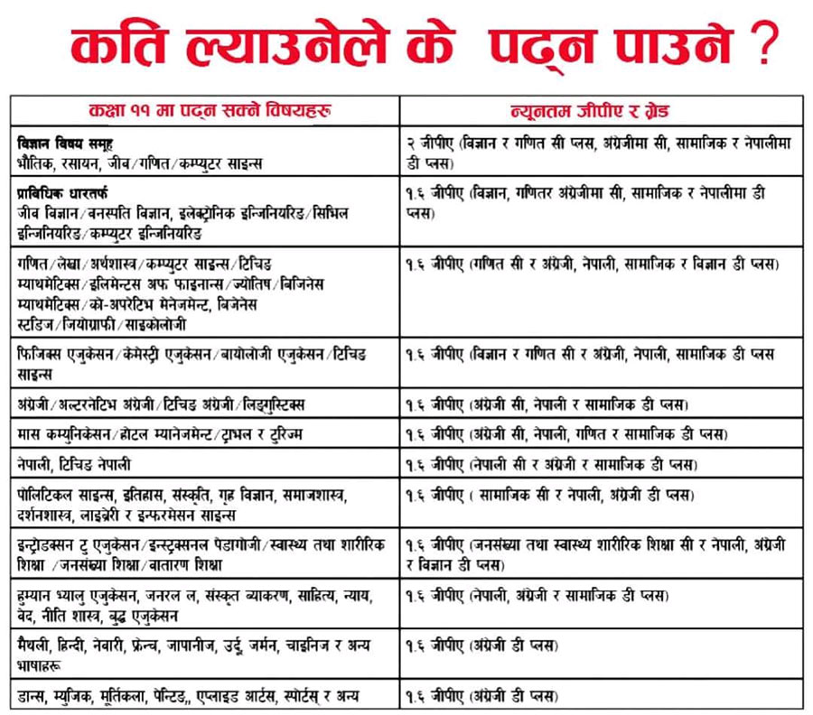 विज्ञान समूह अध्ययन गर्न २.० जीपीएका साथै गणित र विज्ञानमा सी प्लस, नेपाली, अंग्रेजी र सामाजिकमा डी प्लस चाहिने प्रावधान छ । यस्तै व्यवस्थापन समूह अध्ययन गर्न १.६ जीपीएका साथै नेपाली, अंग्रेजी, गणित र सामाजिकमा डी प्लस आएको हुनुपर्नेछ भने मानविकी र शिक्षा समूह पढ्न १.६ जीपीएका साथै नेपाली, अंग्रेजी, सामाजिकमा डी प्लस आवश्यक छ ।