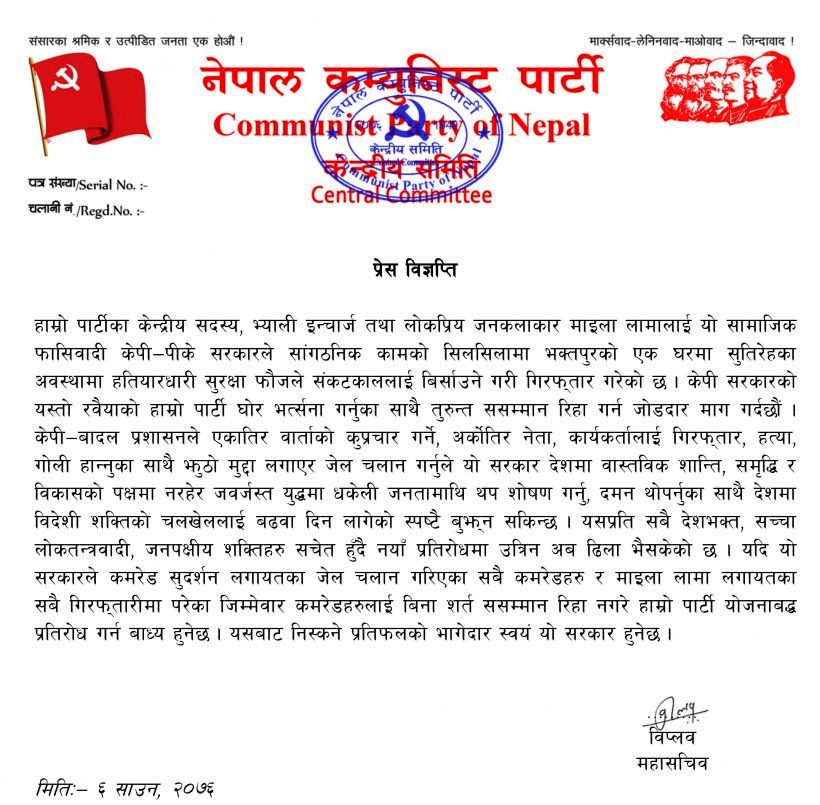 पार्टीका केन्द्रीय सदस्य, भ्याली इन्चार्ज तथा लोकप्रिय जनकलाकार माइला लामालाई यो सामाजिक फासिवादी केपी सरकारले सांगठनिक कामको सिलसिलामा भक्तपुरको एक घरमा सुतिरेहका अवस्थामा हतियारधारी सुरक्षा फौजले संकटकाललाई बिर्साउने गरी गिरफ्तार गरेको बिज्ञप्तिमा उल्लेख छ ।