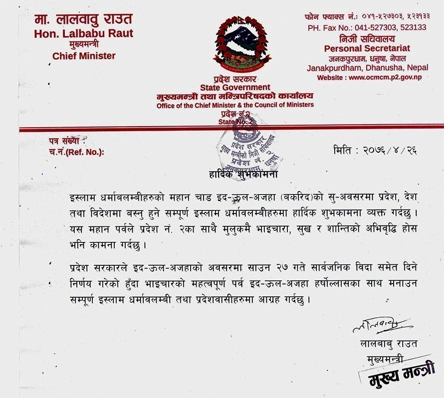 मुख्यमन्त्री राउतले साउन २७ गते सोमबार सार्वजनिक विदाको जानकारी दिँदै इदका अवसरमा समस्त मुस्लिम समुदायलाई शुभकामना सन्देश पनि दिएका छन् । शुभकामना सन्देशमा उनले इद पर्वले प्रदेश २ का साथै मुलुकमै भाइचारा, सुख र शान्तिको अभिवृद्धि होस् भनी कामना गरेका छन् ।