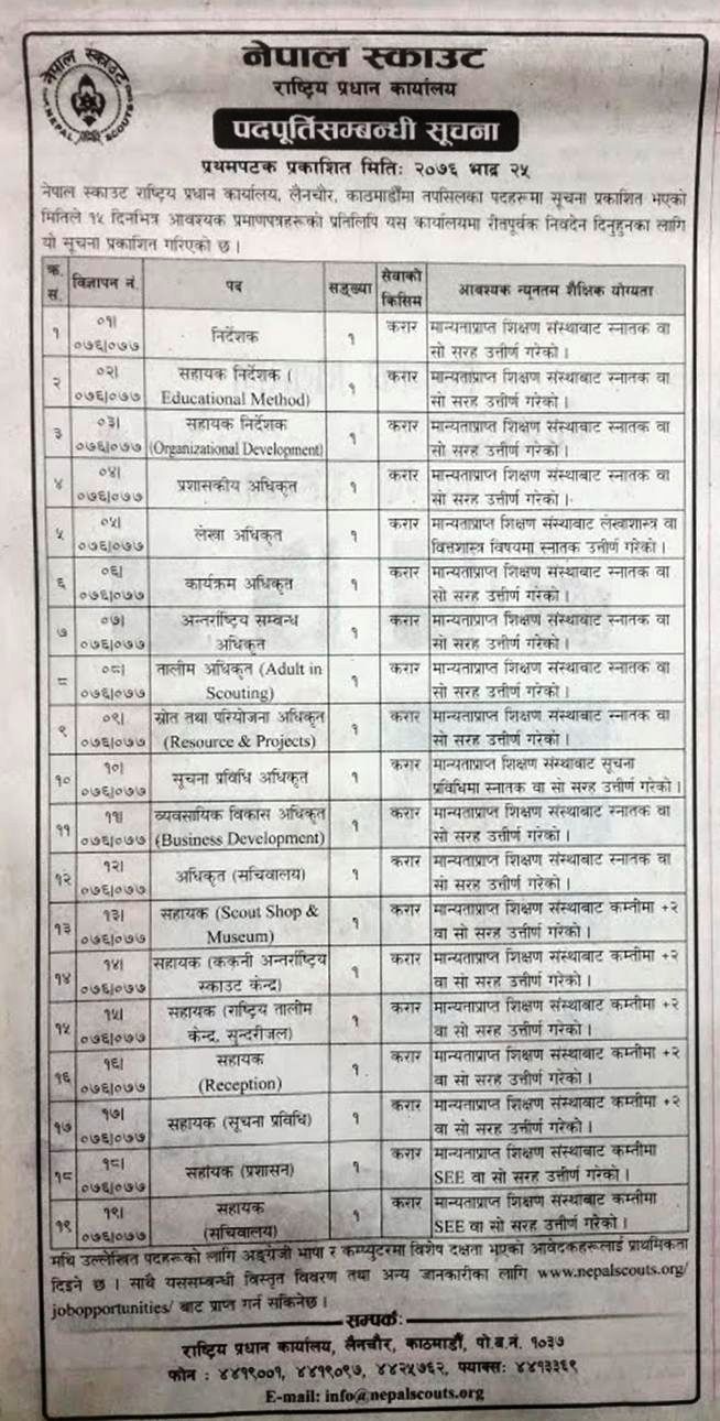 त्यस्तै स्काउटले व्यवसायिक विकास अधिकृत, अधिकृत (सचिवालय), सहायक, सहायक (ककनी अन्तर्राष्ट्रिय स्काउट केन्द्र), सहायक (राष्ट्रिय तालिम केन्द्र सुन्दरीजल), सहायक, सहायक (सूचना प्रविधि), सहायक (प्रशासन) र सहायक (सचिवालय) पदमा आवेदन आह्वान गरेको हो ।