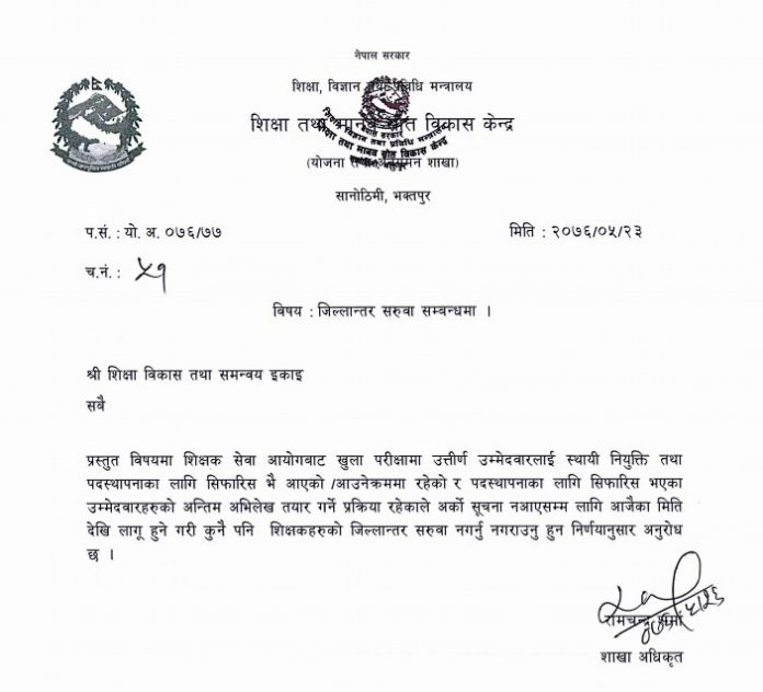 शिक्षक सेवा आयोगबाट खुला परीक्षामा उत्तीर्ण उम्मेदवारहरुलाई स्थायी नियुक्ति तथा पदास्थापनाका लागि सिफारिस भई आएका र आउने क्रम जारी रहेको भन्दै केन्द्रले पदस्थापना प्रक्रिया नसकिञ्जेल जिल्लान्तर सरुवा नगर्न निर्देशन दिएको हो ।