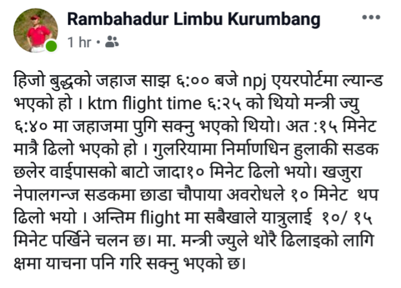 उहाँले हुलाकी सडक छलेर बाइपासको बाटो जाँदा १० मिनेट र नेपालगन्जमा छाडा पशुले बाटो छेक्दा १० मिनेट ढिला भएको पनि दावी गर्नुभएको छ ।