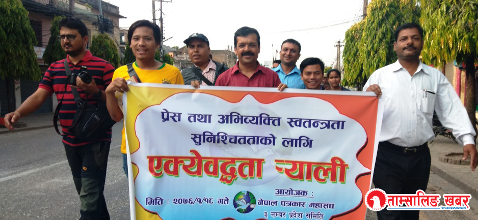 हेटौंडा – नेपाल पत्रकार महासंघको संघिय सर्कुलर अनुसार प्रेस तथा अभिव्यक्ति स्वतन्त्रताका माग गर्दै तिन नम्बर प्रदेशको राजधानी हेटौंडामा आज पत्रकारहरुले र्याली गरेको छ । नेप्रेस स्वतन्त्रता सुनिश्चितताको लागि ऐक्यबद्धता लेखिएको व्यानर सहित पत्रकार महासंघ तिन नम्बर प्रदेशको आयोजनामा बुधबार विहान प्रेस तथा अभिव्यक्ति स्वतन्त्रता सुनिश्चितताको लागि एक्यबद्धता र्याली निकालिएको हो । एक्यबद्धता र्यालीलाइ सम्बोधन गर्दै तिन नम्बर प्रदेशको पत्रकार महासंघका अध्यक्ष प्रताप विष्टले समाचार लेखेकै कारण पत्रकार पक्राउ पर्न नहुने भन्दै प्रेस तथा अभिव्यक्ति स्वतन्त्रताको ग्यारेण्टी राज्यले गर्नुपर्ने बताएका थिए । आफूहरुको माग पूरा नभएसम्म चरणबद्ध आन्दोलनमा होमिने...